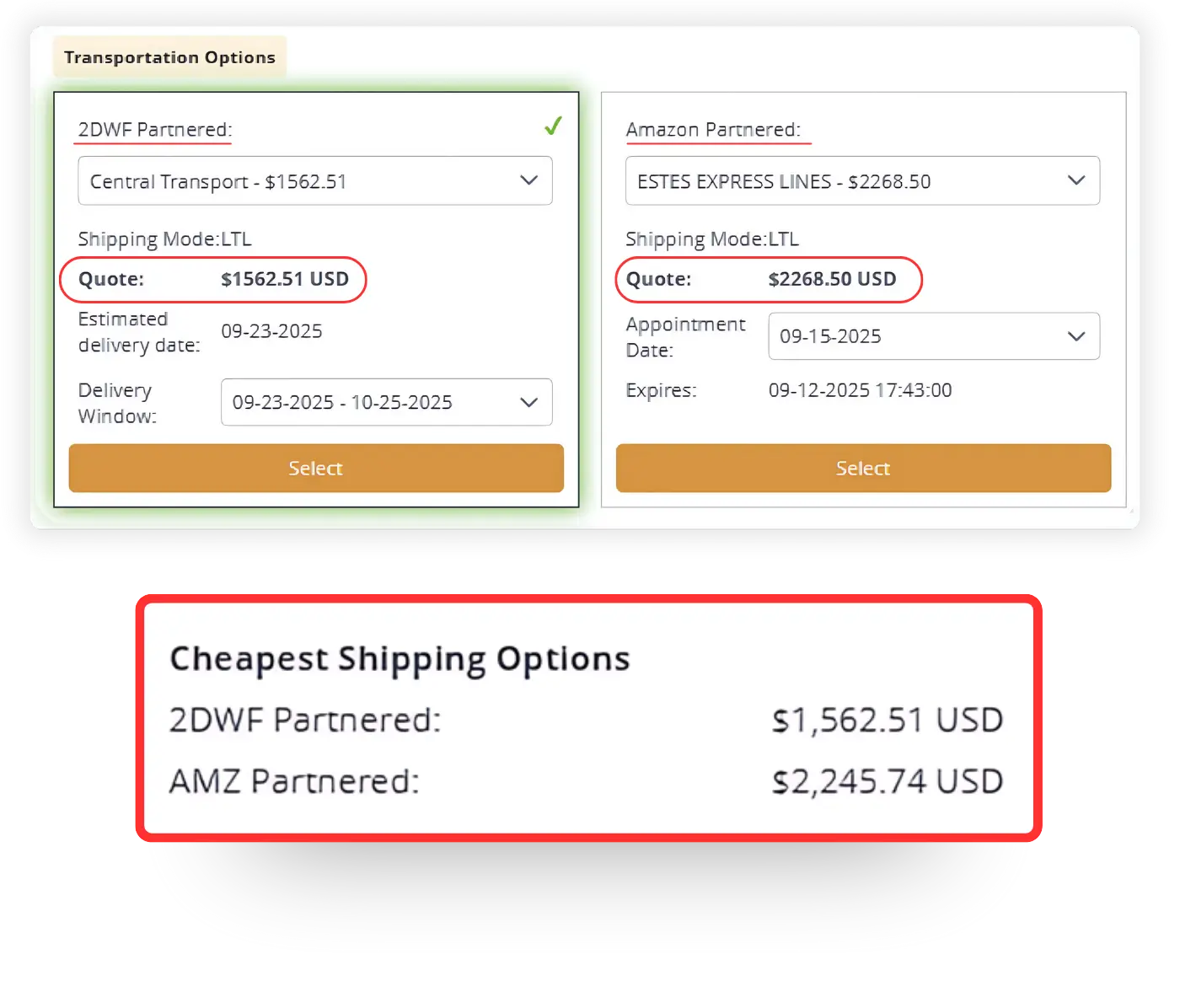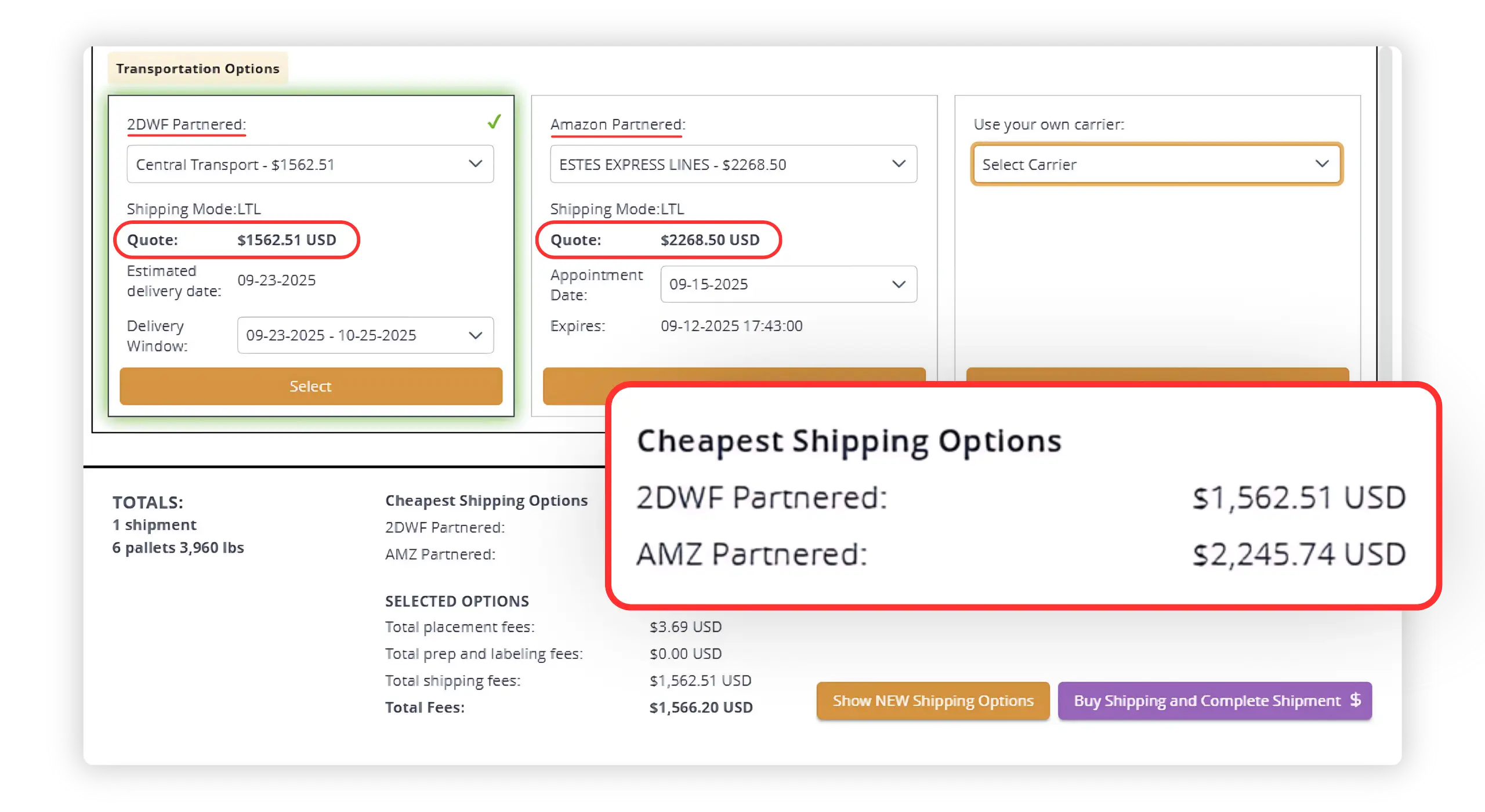 When you’re ready to ship, you’ll get a side-by-side comparison of Amazon’s Partnered Carrier rates vs. our own deeply discounted rates, so that you can always find the cheapest way to ship your products. Our users regularly save hundreds, sometimes thousands, of dollars per shipment simply by choosing a 2DWF carrier instead of Amazon’s.
